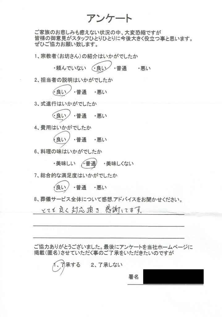 献体葬にてご葬儀 埼玉県所沢市のお客様より葬儀後アンケートいただきました。 -