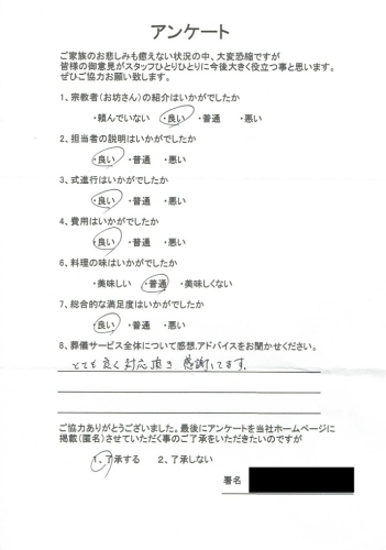 思い出の里会館にて通夜,告別式(一般葬) さいたま市岩槻区のお客様より葬儀後アンケートいただきました!